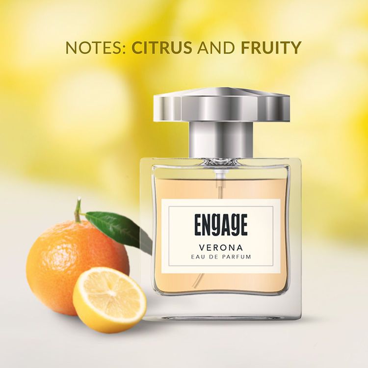 Description : Inspired by citrus groves, Engage Verona Perfume is a premium, long-lasting perfume for women. With the fruity and citrus burst of freshness at the top, floral and spicy notes at the heart, adding playfulness, and woody and musky notes at the base, making the senses feel exquisite, the perfume brings joy and radiance. The fragrance is ideal for everyday use, casual meetings, brunch dates, gifting, etc.
