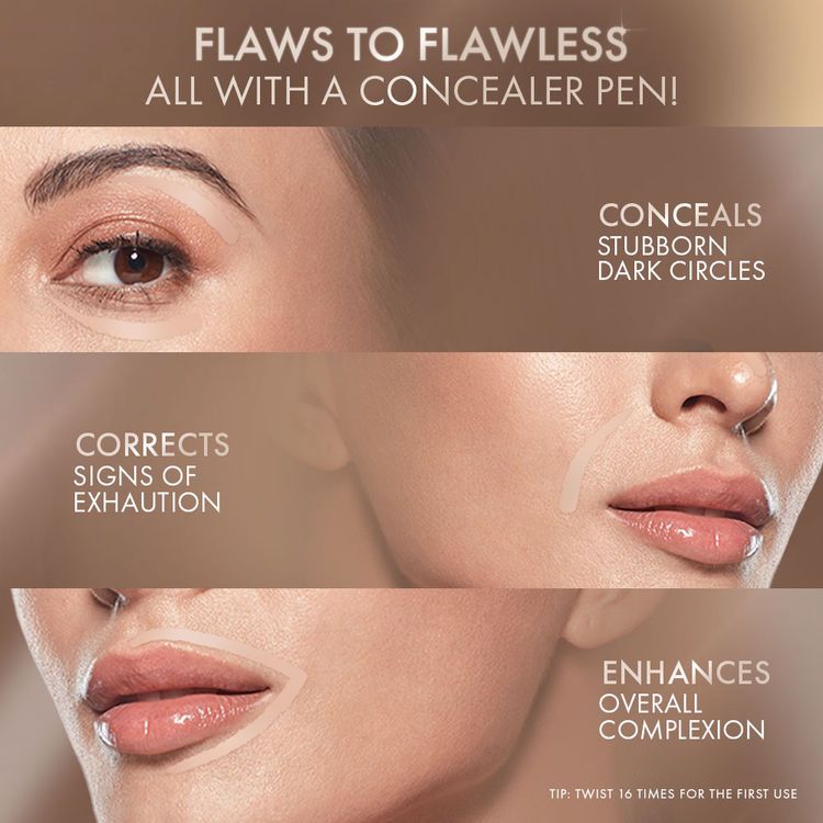 Twist the pen clockwise, apply the concealer by using the brush tip. Blend the concealer evenly using your fingers.